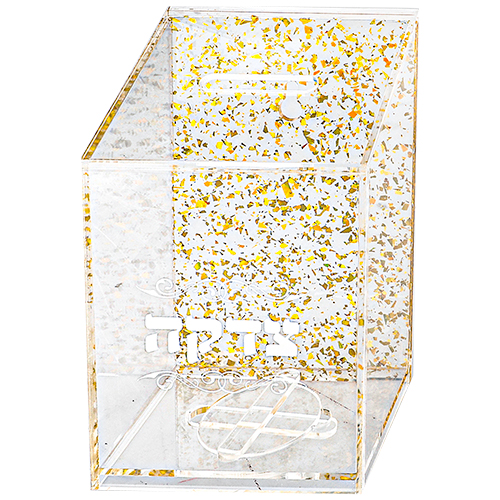 קופת צדקה פרספקס נצנצים זהב עם הדפסה 16 ס"מ